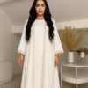 An abaya of quiet grace, Seraphis features delicate front lace detailing in soft beige and blush tones—like whispered wings in motion. The same intricate trim graces the sleeves, offering a refined finish. Designed to evoke serene beauty, this piece effortlessly bridges modesty and transcendence, making it ideal for both everyday elegance and elevated occasions.